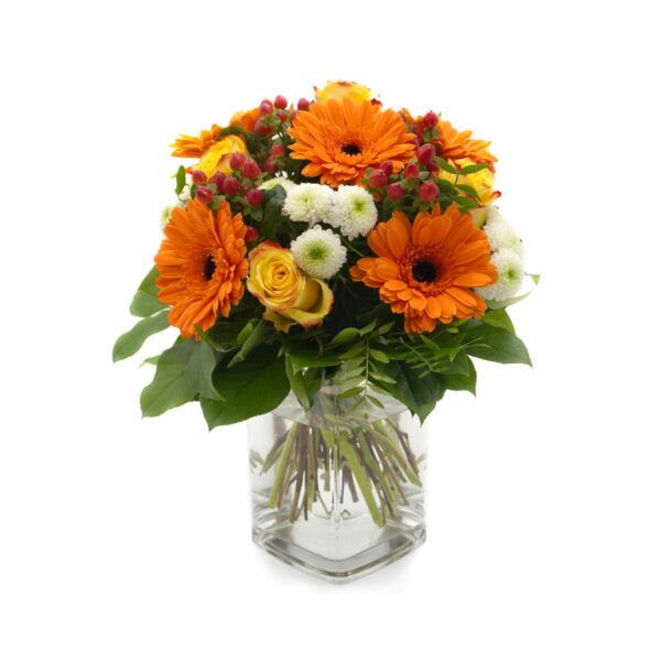 rundgebundener Blumenstrauß in kräftigen Farben orange/ rot/ pink mit Gerbera, Rosen, Santini und Pistazie
