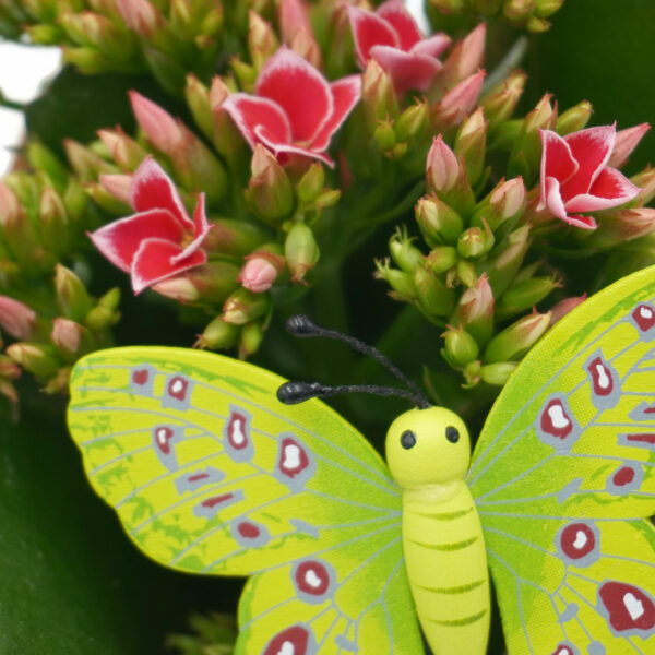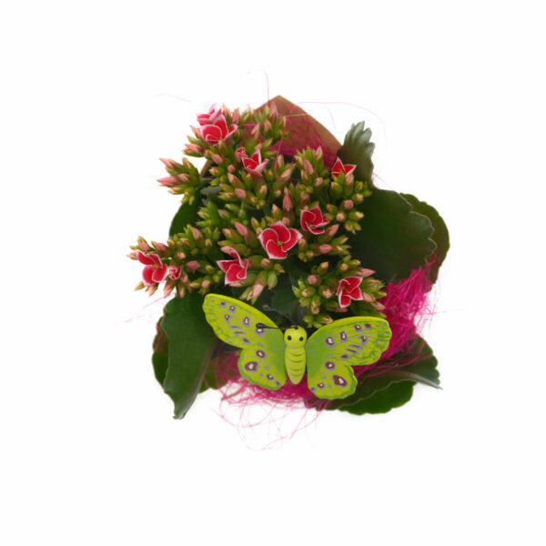 blühende Zimmerpflanze „Kalanchoe“ mit Übertopf und Dekoration