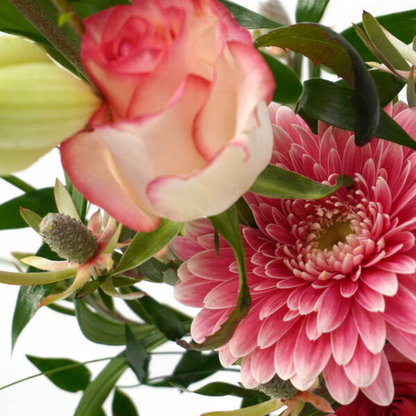 Blumenstrauß als Rakete gebunden mit bspw. Lilien, Rosen und Gerbera